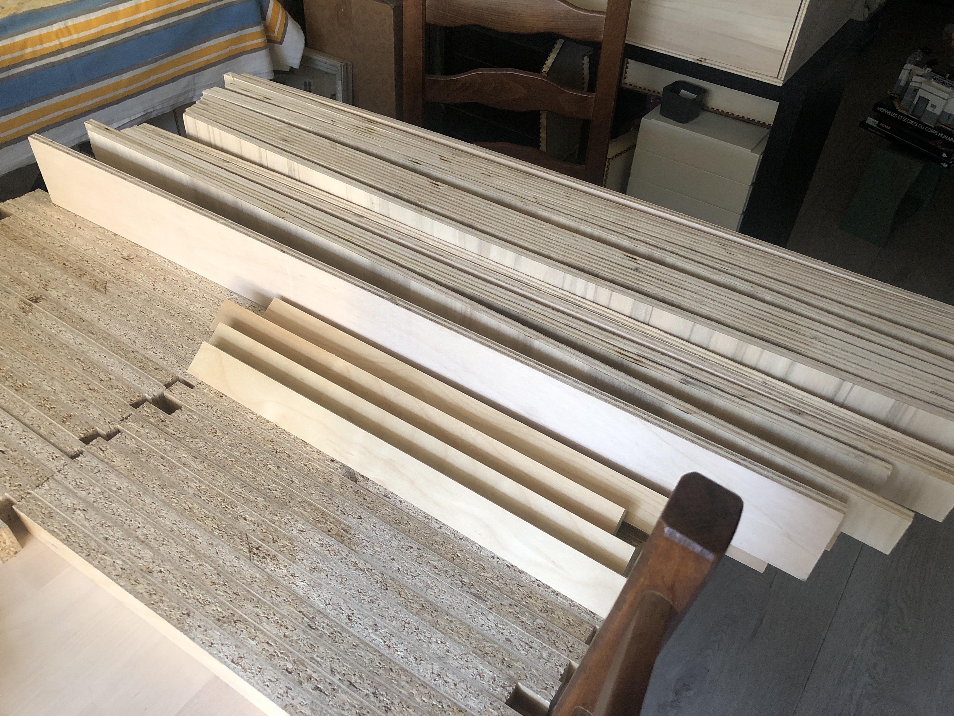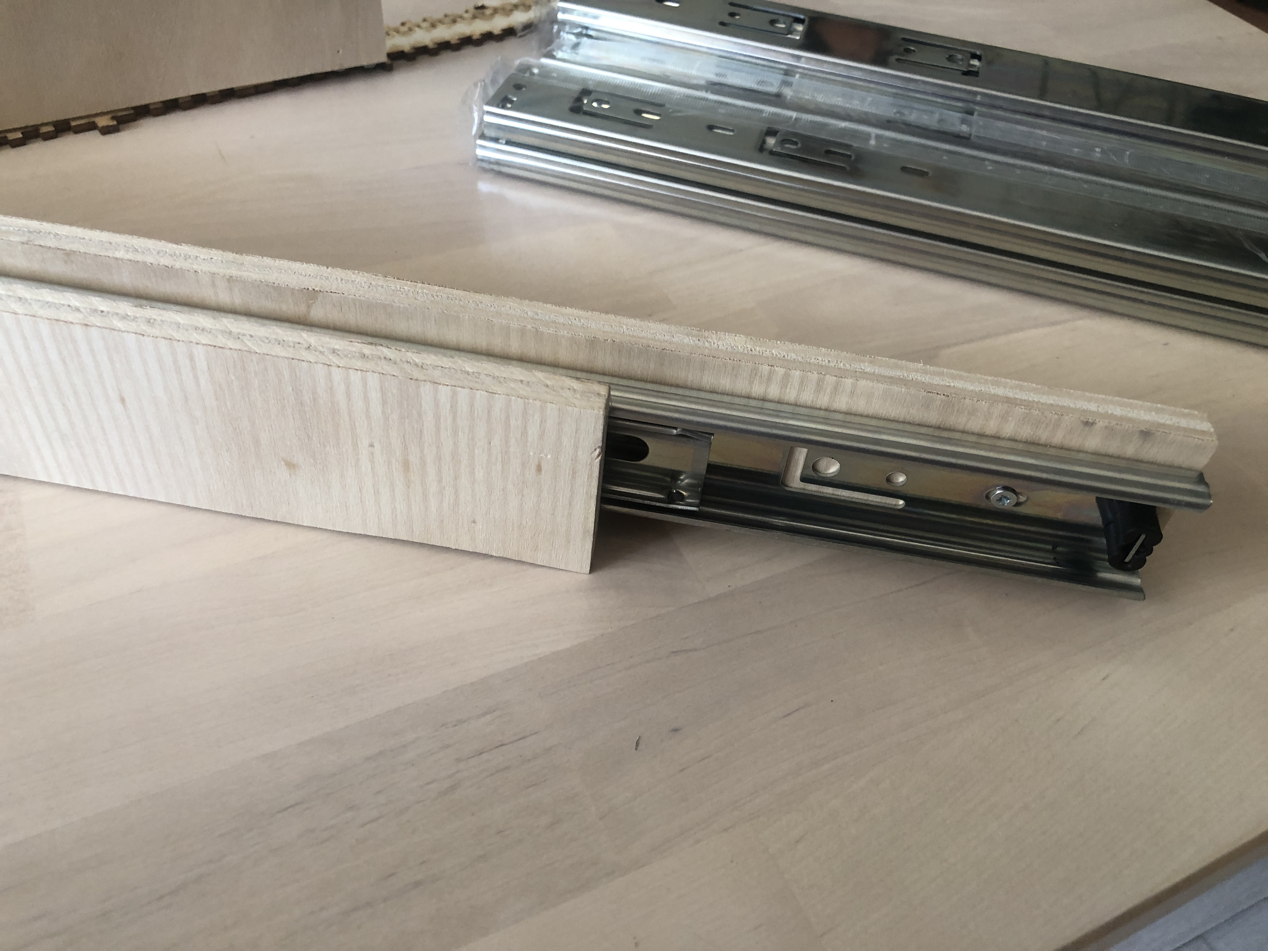 After some experimentation with the slides, I built a first furniture prototype with 10mm poplar plywood. I cut the pieces with a jigsaw but the result was very mediocre. Nothing was really straight, and the opening/closing of drawers wasn’t smooth and open drawers would collide.