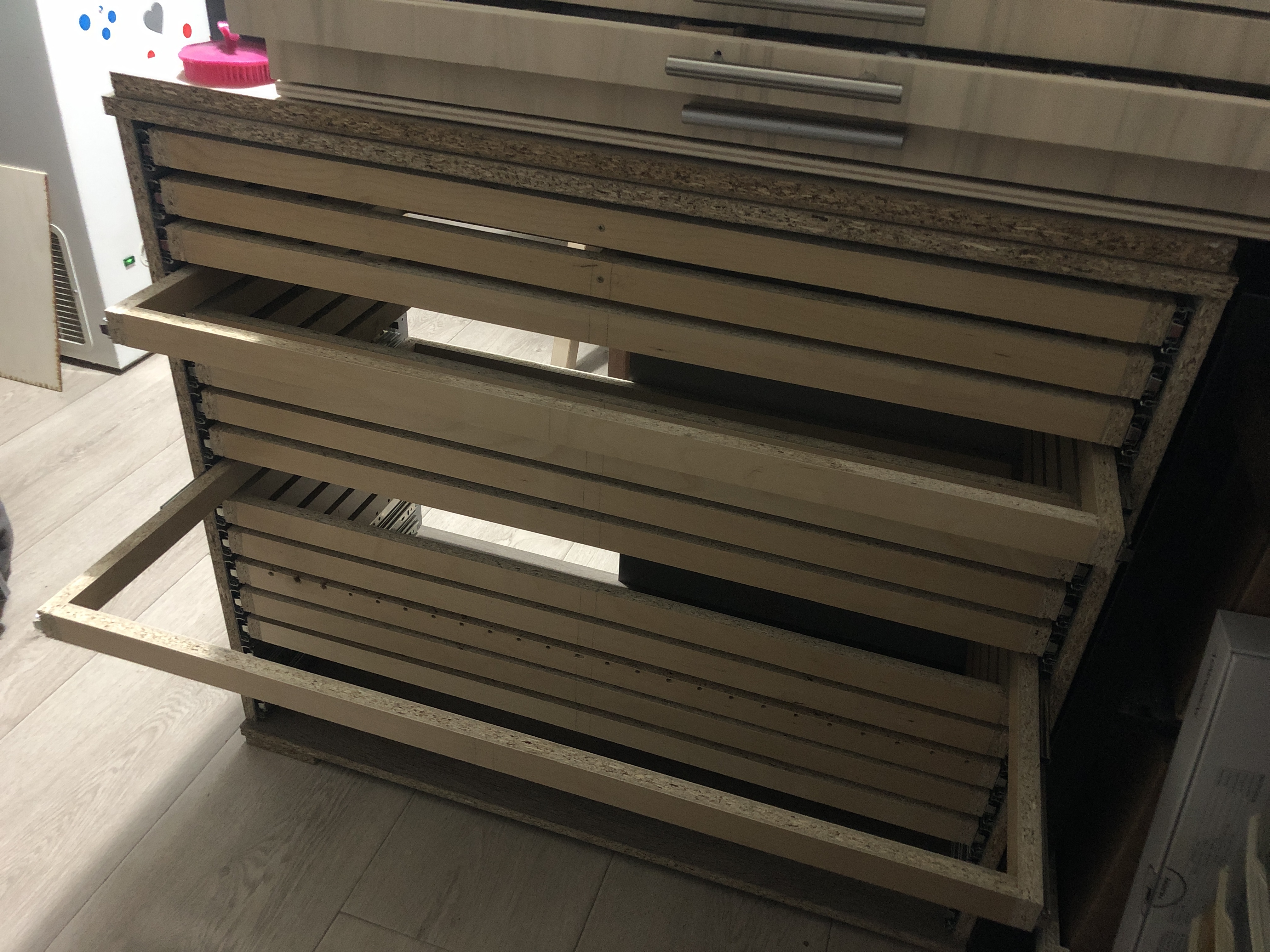For the next step, I wanted a quality feel when opening and closing the drawers. This was important to me. I wanted my drawers to give an impression of solidity and quality, with smooth opening and closing, without tilting as the drawer opens, and without fear of dislodging the drawer if opened too quickly. I also wanted the drawers to be able to open to full depth to allow access even to boxes at the back.